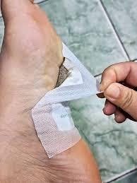 Retira el adhesivo del parche y colócalo con el lado del polvo hacia la piel, en la planta de cada pie.